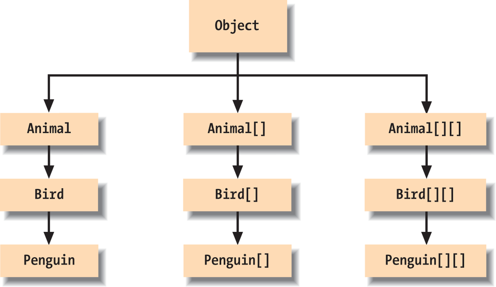 Figure 6-8 illustrates the class hierarchy for arrays of these classes. Arrays of the same dimension are related to one another in the same manner as their base type classes. In our example, Bird is a subclass of Animal, which means that the Bird[] type is a subtype of Animal[]. In the same way a Bird object can be used in place of an Animal object, a Bird[] array can be assigned to a variable of type Animal[]: