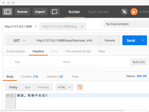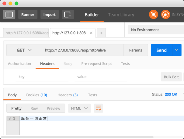 接下来我们来验证一下, 我们所实现的功能是否有效吧. 首先在 Postman 中, 调用 /aop/http/alive 接口, 请求头中不加任何参数: