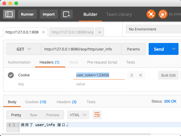 当我们请求 /aop/http/user_info 接口时, 服务返回一个权限异常的错误, 为什么会这样呢? 自然就是我们的权限认证系统起了作为: 当一个方法被调用并且这个方法有 AuthChecker 标注时, 那么首先会执行到我们的 around advice, 在这个 advice 中, 我们会校验 HTTP 请求的 cookie 字段中是否有携带 user_token 字段时, 如果没有, 则返回权限错误. 那么为了能够正常地调用 /aop/http/user_info 接口, 我们可以在 Cookie 中添加 user_token=123456, 这样我们可以愉快的玩耍了: